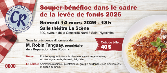 Levée de fonds 2026 sous la présidence d’honneur de Monsieur Robin Tanguay. Tous les dons sont importants, participez à cette grande oeuvre! Dans le cadre de cette levée de fonds, un souper-bénéfice aura lieu le samedi, 14 mars, à 18 h.